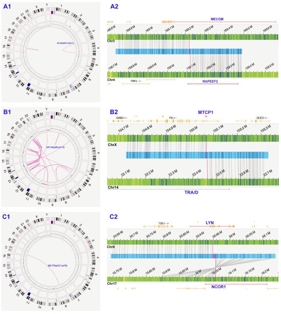 Representative cases exemplifying the clinical utility of the OGM. (A) (case #24): initially diagnosed as MDS was reclassified as AML; (B) (case #15): T-PLL; (C) (case #95): B-ALL. (A1,B1,C1): Circos plots of optical genome mapping outlining the abnormalities; (A2,B2,C2): Genome browser views providing detailed visualization of clinically significant translocations. (A1). t(3;4)(q26.2;q31) and intrachromosomal fusion at 16q. (A2). t(3;4)(q26.2;q31) leads to MECOM::RAPEEF2. (B1). Highly complex genome including t(X;14)(q28; q11.2), chromoanagenesis involving chromosomes 14, 14, 17 and 20, copy number losses at 6q, 10p, 10q, 13q, 16q and 20q, and gains at 14q and 20q. (B2). t(X;14)(q28; q11.2) resulting in TRA::MTCP1. (C1). t(8;17)(q12.1;p12) and copy number loss at 9p. (C2). t(X;14)(q28; q11.2) resulting in NCOR1::LYN.