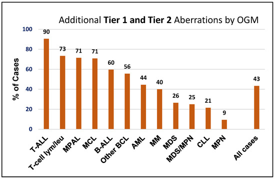 When considering both Tier 1 and Tier 2 variants, OGM detected additional variants in 225 of 519 cases (43%), with detection rates ranging from 9% in MPN to 90% in T-ALL. Furthermore, more than 50% of cases with T-ALL, mature T-cell lymphoma/leukemia, MPAL, MCL, B-ALL, and other B-cell lymphomas harbored Tier 1 and Tier 2 aberrations that were exclusively detected by OGM (Figure 4).