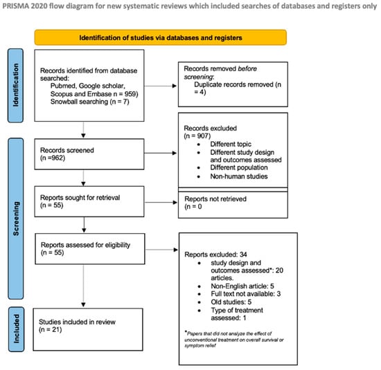 An electronic, systematic, and comprehensive literature review was conducted and reported following the PRISMA 2020 and AMSTAR 2 (assessing the methodological quality of systematic reviews) guidelines [7,8]. The search covered all relevant research literature published from 2010 through March 2024 using MEDLINE (PubMed), Scopus, Google Scholar, and Embase. References from the included studies were also checked to identify any additional relevant papers. The following search terms were used: “Unconventional treatment”, “Complementary medicine”, “Alternative medicine”, “Pancreatic Cancer”. The full search strategy for PubMed is detailed in Appendix A. The study protocol was registered on PROSPERO (ID: CRD42024600460).