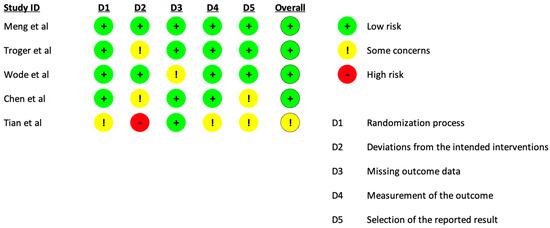 Risk of bias assessment for the five included RCTs, evaluated using the Cochrane Risk of Bias Assessment Tool 2 (Cochrane collaboration, 2019) for RCTs and tabulated using the ROBVIS tool. The assessment considered five domains: D1 (sequence generation), D2 (allocation concealment and blinding), D3 (incomplete outcome data), and D4 (selective outcome reporting). The risk of bias of each study was judged as low risk, high risk, or with some concerns [10,18,19,25,26].
