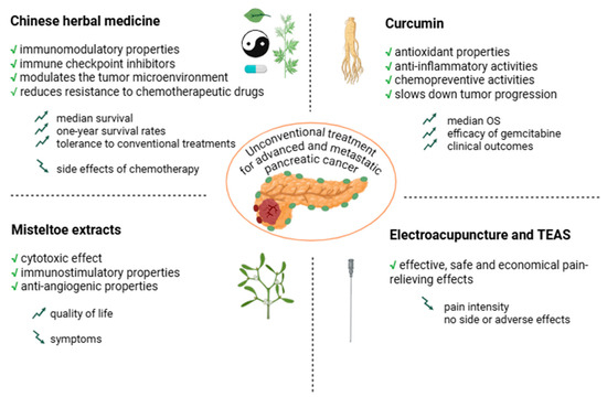 Although preliminary evidence suggests potential benefits for unconventional therapies, the current guidelines do not endorse the use of these types of treatments as adjunct therapy in patients with pancreatic cancer, suggesting ongoing skepticism and resistance towards integrating conventional and unconventional therapies [67].