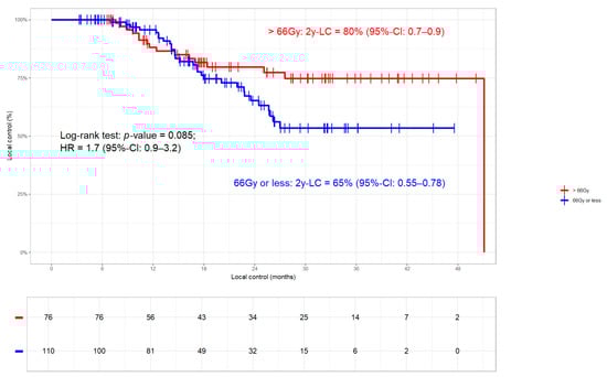 Local control (LC) in dependence of total radiation dose (>/≤ 66 Gy; N = 186). Patients who received >66 Gy had better LC than those without (log-rank p-value 0.085; HR 1.7; 95%-CI 0.9–3.2). In two patients, detailed information on total radiation dose was not available.
