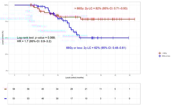 Local control (LC) in dependence of total radiation dose (>/≤66 Gy) in patients who received Durvalumab (N = 111). Patients who received >66 Gy had better LC than those without (log-rank p-value 0.068). In two patients, detailed information on total radiation dose was missing.