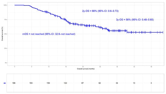 Overall survival (OS) in the whole cohort (N = 188, median not reached). OS rates at 2 and 3 years were 66% and 56%, respectively.