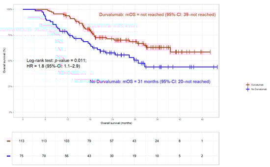 In the whole cohort, 71/188 (38%) patients had died at the time of data extraction. With survival rates of 66% and 56% at 2 years and 3 years, respectively, the median was not reached (Figure 4). Patients who received Durvalumab had significantly better OS compared to those without. While in the first group the median was not reached (2- and 3-year rates of 71% and 63%, respectively), the latter had an mOS of 30.9 months (95%-CI: 20.0–not reached; HR 1.8; 95%-CI 1.1–2.9; p-value 0.011; Figure 5) and 2- and 3-year rates of 58% and 44%, respectively. Again, we tested UICC disease stage, histology, sequence of chemoradiation, PD-L1 status, and the 42-day limit in a time-to-event analysis for their potential influence on OS []. None of these parameters had a significant impact on OS.