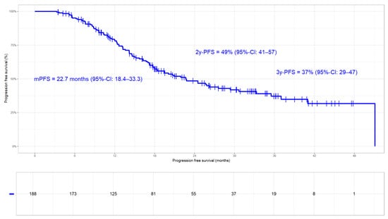 Progression-free survival in the whole cohort: median PFS 22.7 months (95%-CI 18.4–33.3 months). PFS rates at 2 and 3 years were 49% and 37%, respectively.
