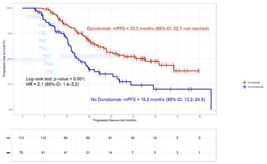 Progression-free survival stratified by Durvalumab. In patients treated with Durvalumab, median PFS was 33.3 months (95%-CI: 22.7—not reached) compared to 15.2 months (95%-CI: 13.2–24.5) in those without (HR 2.1; 95%-CI 1.4–3.2; p-value < 0.001).
