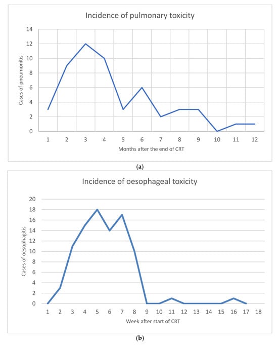 (a) Dynamics in the incidence of pulmonary toxicity during the first year after CRT. (b) Dynamics in the incidence of oesophageal toxicity during four months after the start of CRT.