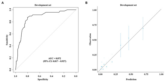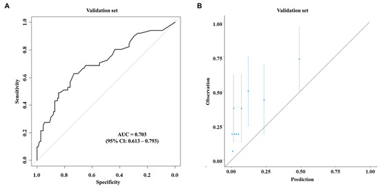 Based on the multivariable analysis using the data of the development cohort, nomograms were developed to predict early recurrence (Figure 1A) and overall survival (Figure 1B). The ROC curve (Figure 2A) and calibration plot (Figure 2B) of the nomogram for early recurrence were drawn from internal validation using 2000 bootstraps. The AUC was 0.872 (95% CI: 0.817–0.927). Figure 3 shows the results of external validation, and the AUC was 0.703 (95% CI: 0.613–0.793). The calculator is accessible online at http://gb4u.medicaldb.co.kr (accessed on 1 April 2025) (Figure S1).
