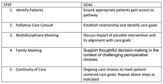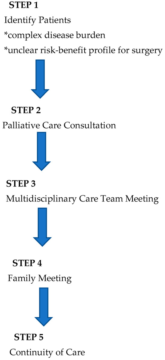 1. Identification of Patients: Patients with complex disease burden that may require surgery with an unclear risk–benefit profile are identified for possible inclusion into the pathway at the time of diagnosis or at the time of perioperative care planning. As this process is viewed as a key effort to ensure that care is aligned with patient and family goals, anyone involved in primary care, consultative care, or perioperative planning can identify and refer a patient.