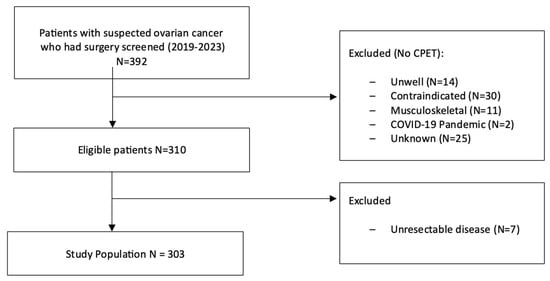 A total of 392 patients underwent surgery for ovarian cancer at the Northern Gynaecological Oncology Centre between 2019 and 2023. Of these, 82 did not have CPET, and in 7 patients cytoreduction could not be performed due to unresectable disseminated disease; these patients were therefore excluded from this study (Figure 1). Our final cohort included 303 patients, with baseline and clinical characteristics presented in Table 1. The median age of the study population was 64 years, with the majority having an ECOG performance score of 0–1 (92.1%). Most patients (79%) were diagnosed with advanced-stage disease (III–IV) with high-grade serous adenocarcinoma being the most common histologic subtype (73.3%).