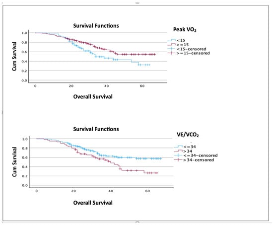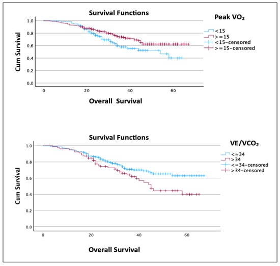 A subgroup analysis of advanced-stage ovarian disease (IIIB to IVB) showed that both VO2 peak ≥ 15 (p = 0.017) and VE/VCO2 at AT ≤ 34 (p = 0.009) were significantly associated with improved survival. The mean OS in peak VO2 groups was 49 months for the peak VO2 ≥ 15 group vs. 40 months for the peak VO2 < 15 group. In the VE/CO2 groups, the mean OS was 49 vs. 39 months (≤34 vs. >34) (Figure 3). Both retained their statistical significance after multivariate analysis, with p = 0.008 (95% CI 0.291–0.833) for VO2 peak and p = 0.025 (95% CI 1.072 to 2.829) for VE/VCO2 at AT.