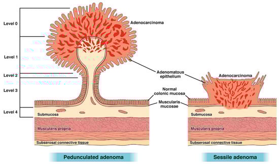 Haggitt et al. described invasion from levels 0–4, with levels 1–4 having submucosal invasion (Figure 3). Haggitt 1 polyps have submucosal invasion limited to the head of the polyp while levels 2 and 3 involve the neck and stalk, respectively. Haggitt 4 polyps have submucosal invasion below the stalk. All sessile polyps are Haggitt 4 by definition (without a stalk) [19].