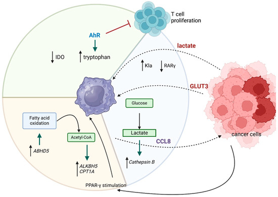 In the case of amino acid metabolism, a crucial role seems to be played by tryptofan and its metabolism main sensor, the aryl hydrocarbon receptor (AhR). In PDAC, high AhR activity was associated with TAMs pro-tumor activity. AhR deletion or pharmacological inhibition the efficacy of immune-checkpoint blockage, infiltration of cytotoxic CD8+ T cells, and reduced PDAC growth, while TAMs immunosuppressive activity was downregulated by reduced tryptophan supplementation [35]. Moreover, in adenomatous polyposis coli (APC), a key tumor suppressor gene, deficient CRC, tryptophan 2,3-dioxygenase 2 (TDO2) was identified as an essential effector that, via Kyn-AhR pathway, upregulate glycolysis and anabolic cancer cell growth [36]. Single-cell RNA analysis of CRC patient samples revealed that the presence of highly expressing IDO1 macrophages, in comparison to low-IDO1 expressing macrophages, was associated with higher immune cell infiltration, higher immune checkpoint expression, and lower tumor progression [37].