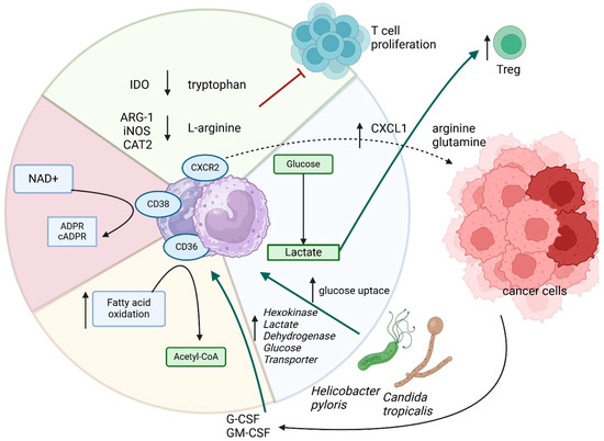 Knowledge about the impact of amino acid metabolism on neutrophils is limited and only reveals that leucine may induce an antigen-presenting program in neutrophils, which is associated with favorable survival in most cancers [51]. In the case of the suppressive aspect role of arginase (ARG1), indoleamine-2,3-dioxygenase (IDO) and overall arginine metabolism by PMN-MDSCs will be as present lately. In PDAC, neutralizing ARG1 metabolism targets the NETs of TANs, which helps restore the activity of CD8+ T cells in the tumor microenvironment, ultimately enhancing the effectiveness of immune checkpoint therapies [52].