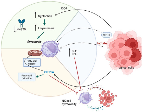 Metabolic alterations in NK cells mediated by gastrointestinal cancers. Tumor cells induce NK cell functional impairment via the production of HIF-1α, lactate, IDO, and CPT1A induction. Elevated tryptophan metabolism, AhR-independent, causes downregulation of crucial activating NK cell receptor NKG2D and ferroptosis, while CPT1A upregulates fatty acid uptake and metabolism. Arrows which are next to the protein names or processes mean up- or downregulation.