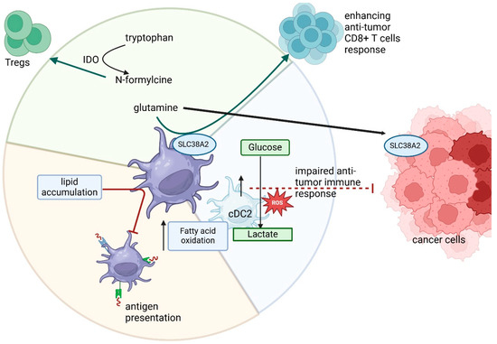 Glutamine plays a key role in enhancing CD8+ lymphocyte antitumor immunity through activation of DC1. However, in the colorectal cancer model, it was shown that glutamine availability is limited by competition between tumor cells and DC1, which use the SLC38A2 transporter for its uptake. This metabolic interaction affects the regulation of the immune response and may determine the efficacy of antitumor mechanisms [103]. Similarly, neutrophils, DC, and monocytes in colorectal cancer patient samples showed increased IDO expression [104]. Where increased expression of IDO in DCs can lead to the conversion of tryptophan to N-formylcine, which promotes the activation and function of Tregs, leading to suppression of the immune response [105].