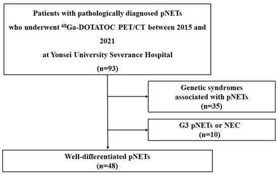 In total, 93 patients with pathologically diagnosed pNETs who underwent [68Ga]-DOTATOC PET/CT at our institution between 2015 and 2021 were identified. Among these patients, those with genetic syndromes associated with pNETs (n = 35) and G3 pNETs or NEC (n = 10) were excluded. Finally, 48 patients with WD pNETs were enrolled in our study (Figure 1).