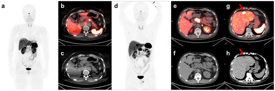 [68Ga]-DOTATOC PET/CT maximum intensity projection (MIP), axial fusion, and CT images of: (a–c) A 60-year-old woman with a G2 pNET located in the pancreatic body and (d–h) A 51-year-old man diagnosed with G2 pNET. The primary tumor in the pancreatic head is noted (e,f). Hepatic metastasis was observed on the axial fusion and CT images ((g,h) red arrows). The metabolic volume of the primary tumor was higher in the patient with initial hepatic metastasis than in the patient without metastasis (TLSRE: 266.96 vs. 16.07, SRETV: 7.23 vs. 0.94). The values of other PET/CT indices were as follows: SUVmax: 65.37 vs. 31.72, SUVmean: 36.91 vs. 17.08. Abbreviations: Ga, Gallium; PET/CT, positron emission tomography/computed tomography; SUV, standardized uptake value; max, maximal; SRETV, somatostatin receptor-expressing tumor volume; TLSRE, total lesion somatostatin receptor expression.