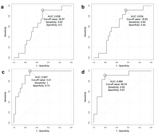 ROC curve analysis for [68Ga]-DOTATOC PET/CT indices in predicting initial metastasis. (a) SUVmax, (b) SUVmean, (c) SRETV, and (d) TLSRE. Abbreviations: Ga, gallium; PET/CT, positron emission tomography/computed tomography; SUV, standardized uptake value; max, maximal; SRETV, somatostatin receptor-expressing tumor volume; TLSRE, total lesion somatostatin receptor expression.