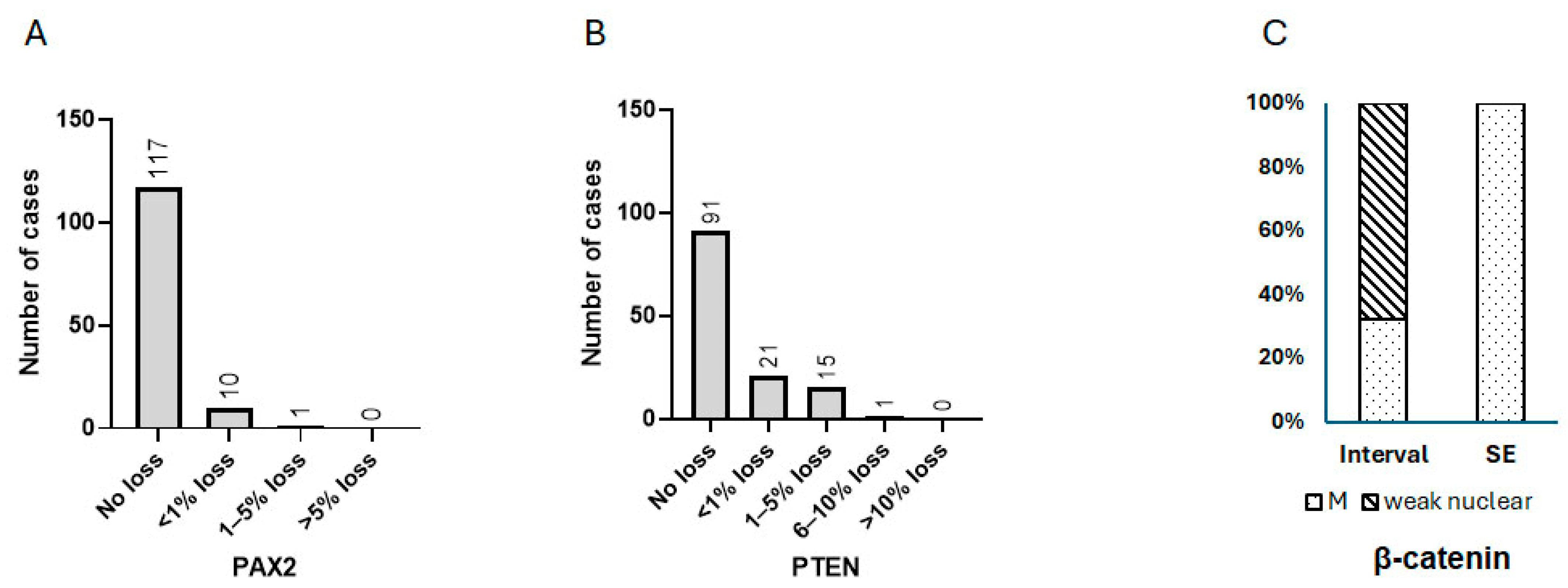 3.1. Expression Characteristics of PAX2, PTEN, and β-Catenin in Benign Interval and Secretory Endometrium