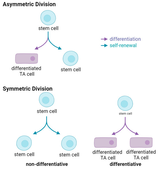 Modes of Stem Cell Division. Upper, an asymmetric division results in the production of two daughter cells with different fates—one remains a stem cell, the other becomes a differentiated transient amplifying (TA) cell. Lower left, symmetric non-differentiative division generates to two daughter stem cells. Lower right, symmetric differentiative division produces two differentiated transient amplifying daughter cells.