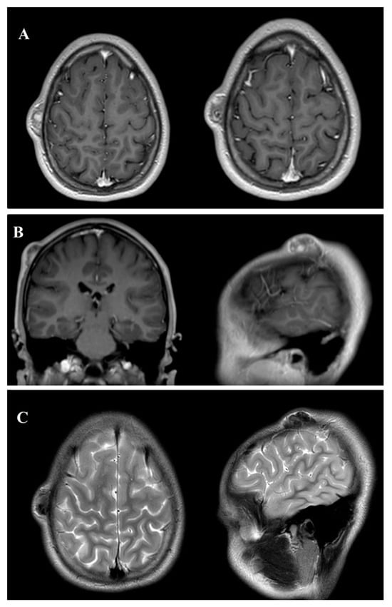 A preoperative MRI of the brain and cranial structures was performed using multiple sequences (SE, TSE, DWI, FLAIR, STIR, FFE, and 3D-TFE) before and after intravenous contrast administration. The imaging revealed a well-defined, expansile lesion measuring 30 mm anteroposteriorly and 9 mm craniocaudally, located in the subcutaneous soft tissues and closely adherent to the outer table of the right parietal bone. The lesion displayed marked contrast enhancement, suggestive of vascularity or active metabolic processes, with evidence of internal calcifications or hemosiderin deposits, indicating chronicity or previous microhemorrhages. Importantly, there was no invasion of the cranial bone or extension into adjacent soft tissues. The brain parenchyma, ventricular system, and major intracranial structures appeared normal, with no significant signal abnormalities or mass effects (Figure 2).