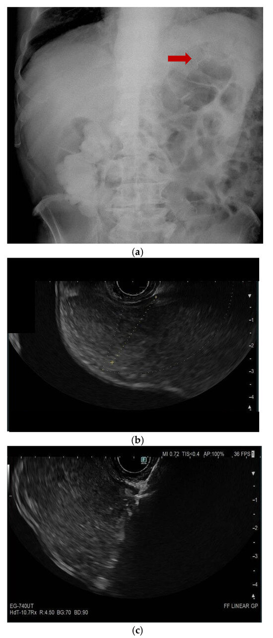 - Mir, A.; Parekh, P.J.; Shakhatreh, M.; Yeaton, P. Endoscopic ultrasound-guided creation of an enterocolostomy to relieve malignant bowel obstruction. Endosc. Int. Open 2019, 7, E1034–E1037. [Google Scholar] [CrossRef] [PubMed]