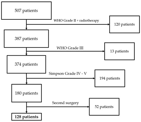 We collected 507 patients at our center between January 2020 and December 2022. We excluded 120 patients because they attained WHO grade II with adjuvant radiotherapy, 13 because they attained WHO grade III, 194 because they attained a Simpson grade of IV–V, and 52 because they were second surgery cases. We then included 128 patients in the study who underwent surgical resection (