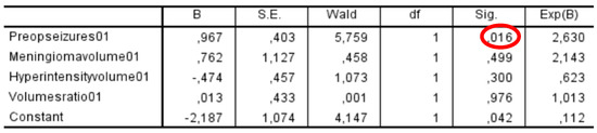 A binomial logistic regression analysis was conducted to determine the independent variables associated with developing postoperative epilepsy. Among the variables analyzed, the only factor that showed a statistically significant association with postoperative epilepsy was the presence of preoperative epilepsy (OR = 2.88; 95% CI: 0.86–5.05;