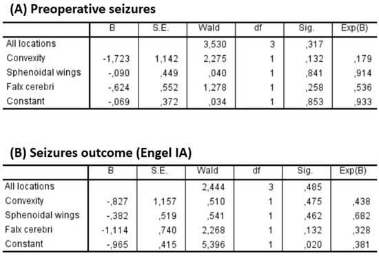 To evaluate the effect of meningioma location on preoperative epilepsy and seizure outcome, we conducted two multivariate logistic regressions. The dependent variable was “preoperative epilepsy” in one model and “seizure outcome” in the other; the latter was defined using the Engel classification (Engel IA: 0; Engel > IA: 1). The independent categorical variables included “convexity”, “sphenoidal wings”, “falx cerebri”, and “olfactory grooves”. Both regressions used “olfactory grooves” as the reference category.