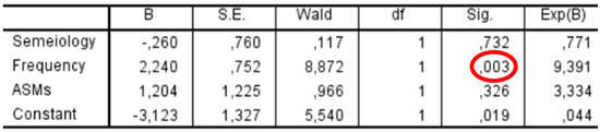 Figure 9). Among the predictors included—seizure semiology (focal vs. primarily generalized), seizure frequency (>1/month vs. ≤1/month), and use of ASMs—only seizure frequency showed a statistically significant association with outcome, with an odds ratio of 9.39 (