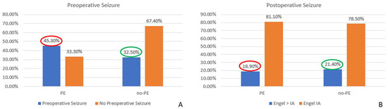 p = 0.0002). This finding suggests that surgical intervention substantially impacted seizure control in this subgroup. Conversely, in cases without PE, although a reduction in seizure frequency was also observed (from 32.5% preoperatively to 21.4% postoperatively), this change did not reach statistical significance (