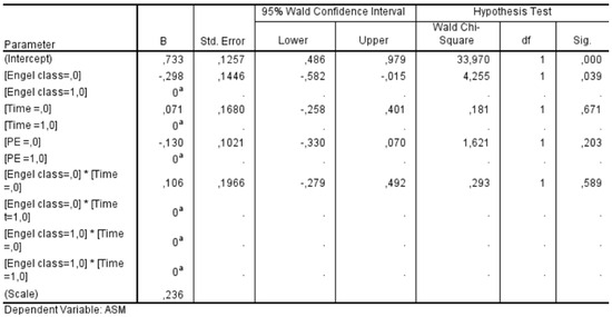 p = 0.203) showed a statistically significant effect. Additionally, the interaction between Engel class and follow-up timing was insignificant (