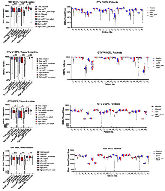 GTV dose metrics of the initial adapted, preRT adapted (“preRT”) and preRT non-adapted plans. Left side: total cohort, left and right adrenal metastases. Right side: fraction-specific dose metrics for individual patients with subscripted characters, indicating the side (L/R). The magnitude of p-values is graphically indicated by stars: * < 0.05, ** < 0.01, *** < 001, **** < 0.0001.