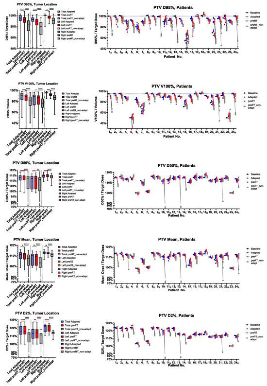 The ratio of preRT plan to adapted plan target volume metrics, such as D95%, V100%, D50%, D2% and Dmean, are shown in Figure 1 for the GTV and Figure 2 for the PTV. In detail, D95% and V100% were significantly inferior in the preRT plans for GTV and PTV in the total cohort (GTV D95%: p < 0.0001, GTV V100%: p = 0.0033, PTV D95%: p < 0.0001, PTV V100%: p < 0.0001) and in left (GTV D95%: p < 0.0001, PTV D95%: p < 0.0001, PTV V100%: p = 0.0260) and right adrenal metastases (GTV D95%: p = 0.0377, GTV V100%: p = 0.0111, PTV D95%: p = 0.0194, PTV V100%: p = 0.0003). The GTV Dmean was only significantly impaired in left-sided metastases (p= 0.0001). GTV D50%, PTV D50% and PTV D2% were not impaired in the preRT plans. Compared to non-adapted plans (“preRT_non-adapt”), the adapted plans (“preRT”) were significantly superior with regard to all target volume metrics in the overall cohort, displayed in Figure 1 and Figure 2 (GTV D50%: p = 0.0075, all other metrics p < 0.0001, respectively).