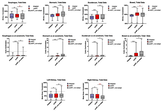 Organs at risk: dose constraints and OAR volume exposed to constrained dose or more in baseline, initial adapted, preRT adapted (“preRT”) and preRT non-adaptive plans. Only patients with overlap of the PTVexpand and the respective OAR are included. The magnitude of p-values is graphically indicated by stars: * < 0.05, ** < 0.01, *** < 001, **** < 0.0001.