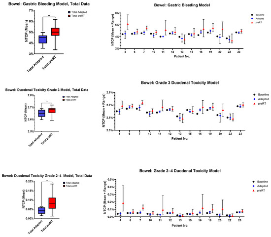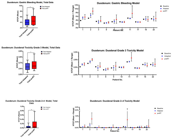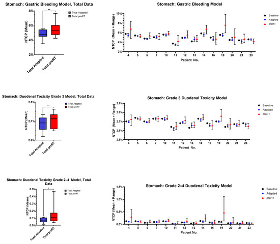 For the OAR with most frequent violation of constraints (stomach, duodenum, bowel), NTCP modeling was performed. The results are depicted in Figure 6. The stomach (p = 0.0036, p = 0.0055 and p = 0.0226) and bowel (p = 0.0031, p = 0.0038 and p = 0.0035) NTCPs were significantly higher in all models, and duodenal toxicity was significantly higher in two out of three models (p = 0.0235, p = 0.0201 and p = 0.0917).