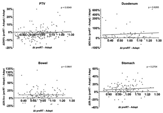 Linear regression for the difference in PTV D95% and the stomach, duodenum and bowel D0.5cc between the adapted and preRT plans was computed to assess dependence on fraction duration (Figure 7). Neither gastric (p = 0.2704), duodenal (p = 0.6265) or bowel (p = 0.9641) maximum doses depended significantly on fraction duration. The PTV D95% significantly increased in longer fractions (p = 0.0049).