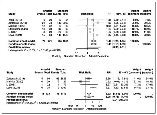 Morbidity was reported in six studies [,,,,,]. Zettervall and Loos contributed the most weight to the pooled estimate in the random effects model. The pooled analysis found no significant increase in morbidity rates between arterial resections (74/271, 27.31%) compared to non-arterial resections (665/4815, 13.81%). The risk ratios indicated a higher risk of morbidity in arterial resection compared to standard resection (RR: 1.48; 95% CI [1.16–1.89]; p = 0.2923), though this difference was not statistically significant. The studies showed low heterogeneity (I2 = 18.6%), suggesting minimal variation in the results across the studies (Figure 2).