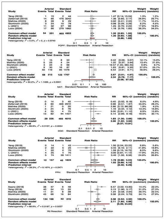Forest plot showing the relative risk ratio of POPF, NAT, DGE, PPH, and R0 resection in arterial versus non-arterial resections [,,,,,,].