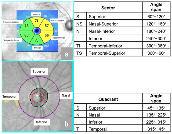 Location and angle spans of the anatomical sectors of macular GCIPL and RNFL around optic disc that were studied, as presented in Figure 1.