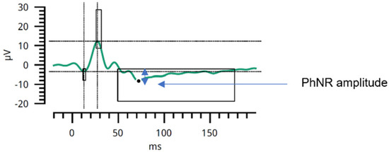 PhNR amplitude. The PhNR amplitude is measured at its minimum, indicated by a black dot. The amplitude is marked with a blue vertical double arrow; μV—microvolts; ms—milliseconds. The figure was created based on clinical data from a representative study participant. The patient provided informed consent for publication. Figure prepared by the first author.
