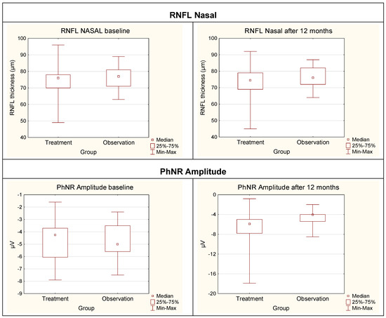 Box-and-whisker plots comparing the treatment group and the observation group for RNFL Nasal and PhNR Amplitude at baseline and after 12 months. RNFL—Retinal Nerve Fiber Layer; PhNR—Photopic Negative Response; μm—micrometers; μV—microvolts; Min–Max—Minium–Maximum.