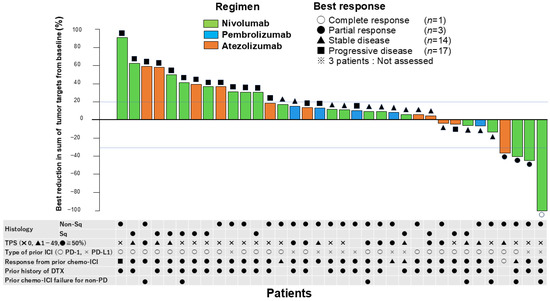 Waterfall plot of best tumor reduction and patient factors. Abbreviations: CR, complete response; PR, partial response; SD, stable disease; PD, progressive disease; Sq, squamous; TPS, tumor proportion score; ICI, immune checkpoint inhibitor; PD-1, anti-PD-1 (anti-programmed death 1); PD-L1, anti-PD-L1 (anti-programmed death ligand 1); DTX, docetaxel.