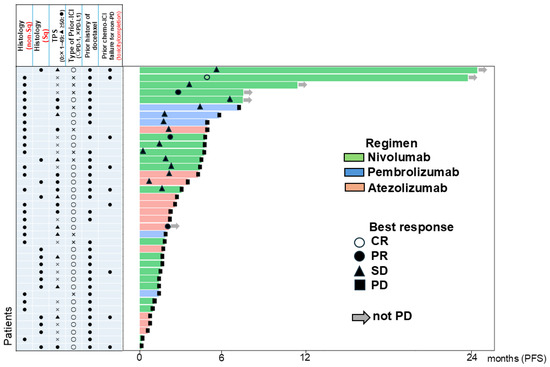 Duration of PFS on ICI retreatment and patient characteristics in Swimmer’s plot. Abbreviations: PFS, progression-free survival; ICI, immune checkpoint inhibitors; Sq, squamous cell carcinoma; TPS, tumor proportion score; CR, complete response; PR, partial response; SD, stable disease; PD, progressive disease.