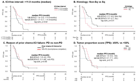 PFS for ICI retreatment according to key subgroups. ICI-free interval longer than the median (11.9 months) or not (A), histology (B), prior chemo-ICI failure for PD or not (C), TPS ≥ 50% or not (D). Abbreviations: ICI, immune checkpoint inhibitor; PFS, progression-free survival; CI, confidence interval; Sq, squamous cell carcinoma; PD, progressive disease; TPS, tumor proportion score.