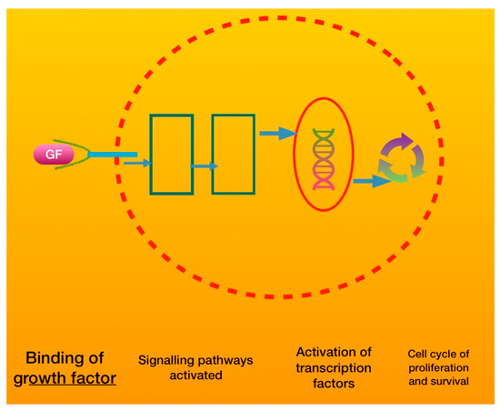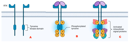 The attachment of a growth factor (GF) to a receptor unit ignites a signaling cascade. Receptor tyrosine kinases (RTKs) are highly specified cell surface receptors for polypeptide growth factors, hormones, and cytokines. Overall, 20 separate RTK groups exist [8]. Their structure comprises an outer membrane ligand-attaching segment, a single transmembrane helix, and a cytoplasmic segment, which contains a proximal-to-membrane modificatory area, a tyrosine kinase domain (TKD), and a carboxyl (C-) appendage [9] (Figure 2).