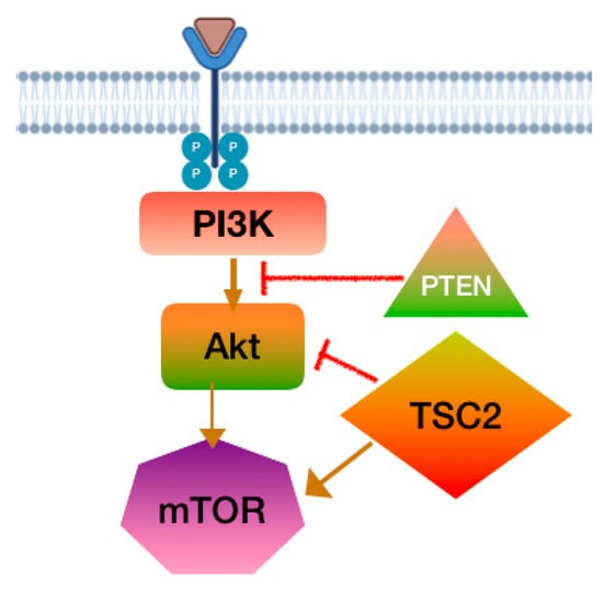 Phosphatase and tensin homolog (PTEN) dephosphorylates PIP3 and negatively modulates PI3K. Following Akt’s activation, the mammalian target of rapamycin (mTOR) exerts its metabolic impact on cellular growth. Aberrant and uncontrolled function of the PI3K pathway, due to mutations, occurs in neoplastic cells. Deletions of PTEN are observed in approximately 40% of gliomas [13] (Figure 3).