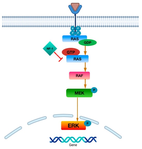 The MAPK pathway. The NF1 gene protein, neurofibromin, negatively regulates RAS protein. Potential NF1 deficiency results in excessive pathway function. Ras proteins dissociate from GDP and attach to a GTP molecule, thus activating the intrinsic GTPase activity. Their function resembles a molecular switch, which initiates intracellular signaling. Their role is crucial for both cell viability and multiplication. Raf kinases (B- and C-) are responsible for endothelial apoptosis and consequently vasculogenesis. MEK and ERK1/2 contribute to cell viability, multiplication, and phenotypical specialization, according to their phosphorylation targets. Every step has a critical role in cell sustainability, and hence altered molecules may have a significant impact. Arrows respond to activation, whereas the inverse red T symbol signifies inhibition.